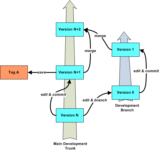 - Branches: Release 버전과 유지보수 버전을 분리하고 싶을 때 주로 사용한다. branch에서 수정하다가 trunk로 병합하는 것이 일반적이다.