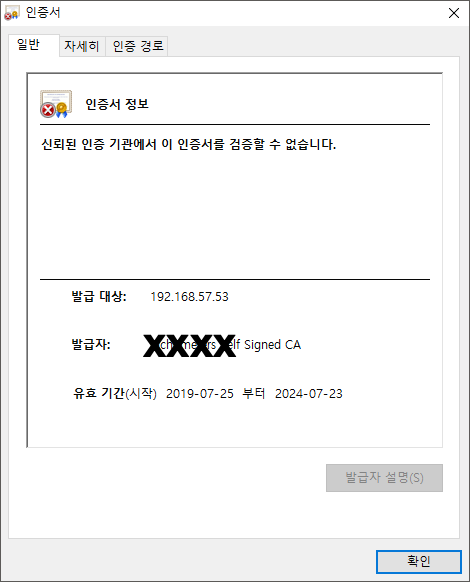- 개인이 직접 발급하고 스스로 서명하여 ROOT CA와 같이 행동할 수 있음 ➜ 개발/테스트를 위해 ROOT CA 인증서 사용, 하지만 정보가 기관에 등록되있지 않으므로