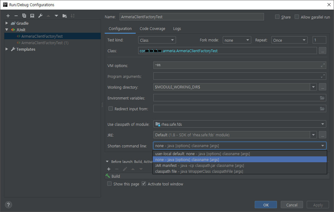 - None: 기본 옵션 값. IDE에서 긴 classpath를 줄여주지 않는다. command line이 OS limit를 초과하는 경우 IDEA는 애플리케이션을 실행할 수 없다. - 에러가 발생했다면 None으로 설정된 상태였을 것이다.