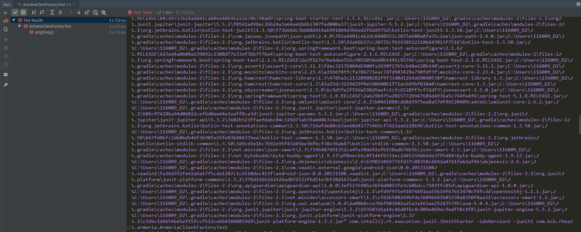 IntelliJ에서 테스트를 실행할 때 또는 개발한 애플리케이션을 실행할 때에도 이러한 에러가 발생하면서 실행되지 않는 경우가 있다. IntelliJ에서 바로 실행할 때에는 class path를 자동으로 잡게 하는데, 이 때문에 run command가 너무 길어져서 발생하는 문제이다. 정상적으로 실행되는 경우에도 알고 보면 아래처럼 어마 무시하게 run command가 길다.