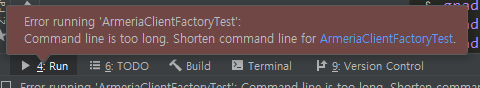 이 run command에 길이가 OS limit를 넘으면 실행할 수 없게된다. 이를 해결하기 위해서는 Run/Debug Configuration에서 Shorten command line의 옵션을 수정한다.