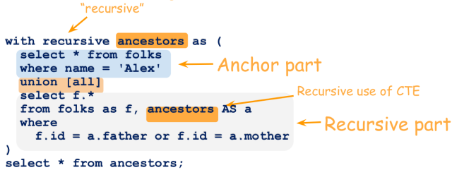 CTE 식은 Anchor part와 Recursive part로 나누어진다. Anchor part가 먼저 호출되어 첫 번째 결과 집합 T0를 만든다. Ti는 입력으로 사용하고, Ti+1은 출력으로 사용하여 Recursive part를 호출한다. 더 이상 반환할 결과가 없을 때까지 이를 반복하고 모든 결과를 UNION ALL 한 결과 집합을 반환한다.