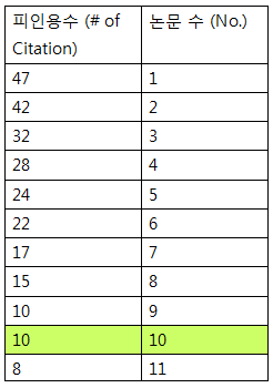 H-index 설명: 표와 같이 자신이 저널에 등재한 전체 논문중 많이 인용된 순으로 정렬한 후, 피인용수가 논문수와 같아지거나 피인용수가 논문수보다 작아지기 시작하는 숫자가 바로 나의 h가 됩니다. 이 표에서는 10이 H-지수가 되는 것입니다. 다시 말하여, 이 연구원은 논문 인용횟수가 10이 넘는 논문이 적어도 10편이 된다는 것을 의미합니다.